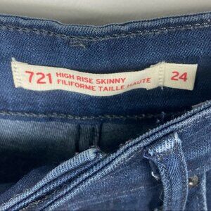 Levis 721 High Rise Skinny Jeans in Women's Size 24. Style #188820012. 73% cotton, 19% poly, 7% modal and 1% elastane. Machine washable. Zipper fly with button closure. Belt loops. Classic 5 pocket styling. Very good pre-loved condition. No visible flaws.
