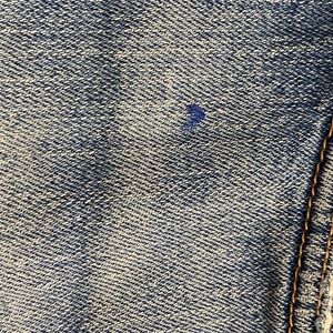 Very Well worn in, faded & IMO look great. Just under left pocket with a blue pen mark (?) stain. (See last pic) Adds to the distressed vintage 90s vibe