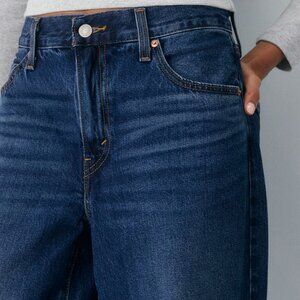 These are ’90s-inspired Levi’s Premium® jeans with a mid rise, straight leg and a relaxed fit. They’re made with non-stretch cotton denim. This version comes in a dark indigo wash with a worn-in look. Color is She's Nice. Size 27.