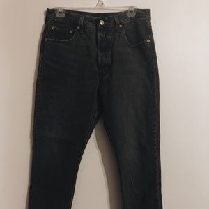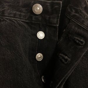 Ankle-length black Levi's jeans with threaded bottoms and button zipper.