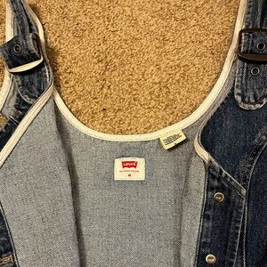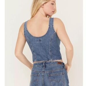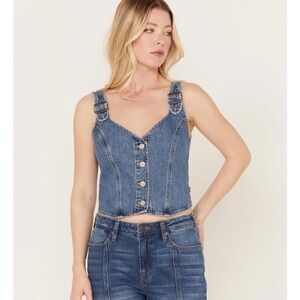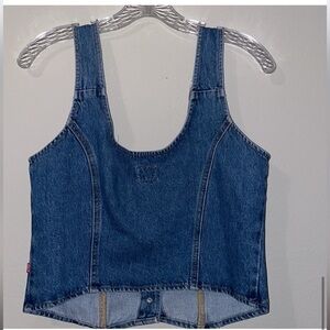 Stylish denim vest with button-up front. Features adjustable straps. I love this vest. It was just a bit too big on me.
