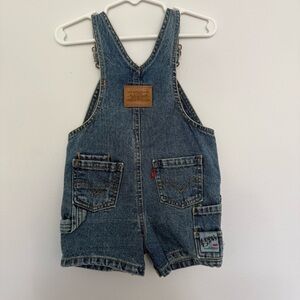 These Levi's overalls feature a classic medium-wash blue denim with a slightly worn-in look, perfect for casual outings. The traditional overall style is complemented by adjustable shoulder straps for a comfortable fit. Ideal for warm weather, these overalls offer a timeless appeal.