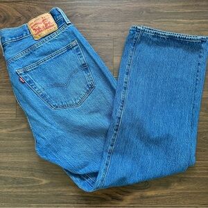 These Levi's jeans feature a timeless straight-leg cut in a classic blue wash, perfect for everyday wear. Crafted from traditional cotton denim, they offer a comfortable fit with subtle fading that enhances their authentic look. The iconic Levi's leather patch on the waistband adds a touch of signature style. Button fly