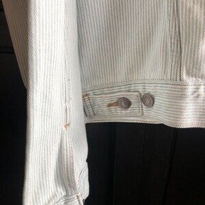 Brand new with tags striped jean jacket, size XL. Approximately 22" pit to pit, and 23" long. Light blue stripe which is pretty rare.