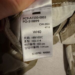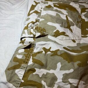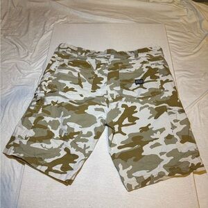Levi's cargo shorts with a green and tan camouflage pattern. Ideal for casual wear and outdoor activities. Small hole by waist band