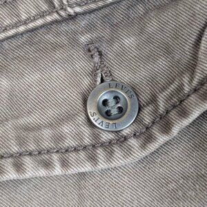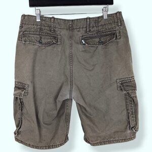 These cargo shorts by Levi's are made of 100% cotton and are a brownish green colour. The shorts have a button and zipper front opening, slit-like front pockets, 2 back button pockets, and 2 side cargo button pockets. The buttons are metal and each of them says Levi's. The shorts have normal wear, most visible in the back crotch where the fabric has been worn a little light. This area is really hard to see when the shorts are being worn but is worth mentioning. There is also wrinkling from storage, but the shorts are still very wearable.