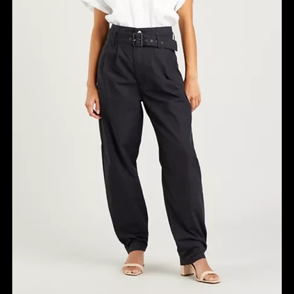black Levi's High Loose Taper Pants with adjustable belt. front pleats with side pockets, and slit real back pockets. 60% cotton, 40% polyester. size 26x30.