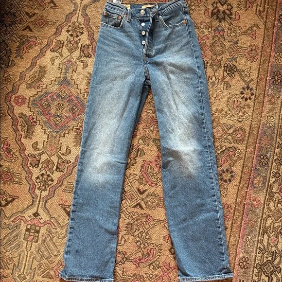 Classic high rise jeans. Button fly closure. Timeless blue denim. Ribcage straight leg