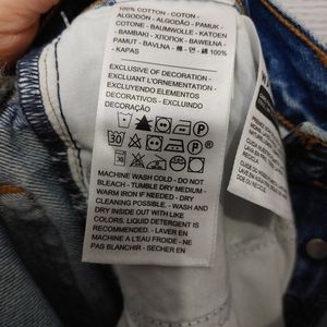 Stylish high rise jeans. Classic blue denim. Distressed details. Perfect for casual wear.
