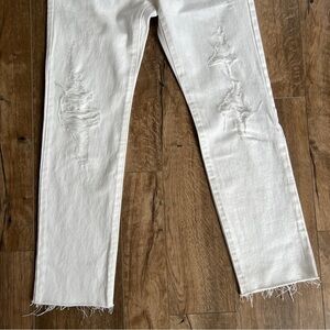 Iconic Timeless summer white distressed premium denim high rise button fly frayed raw hem straight leg ankle jeans