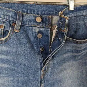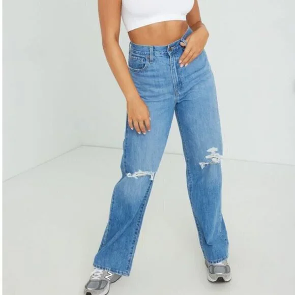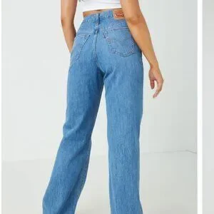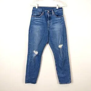 Levi's high-rise straight ripped jeans with five-pocket styling and a button and zip fly.