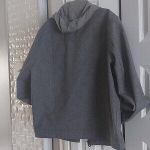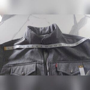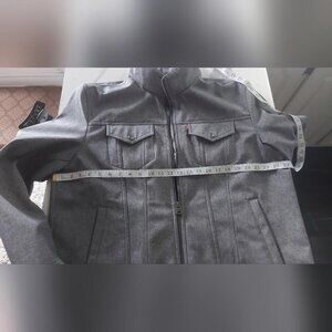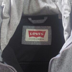 Levi's Streetwear jacket combines a Trucker silhouette with a hood. Sleek zip-up design in versatile gray poly shell. Your essential Utility layering piece.