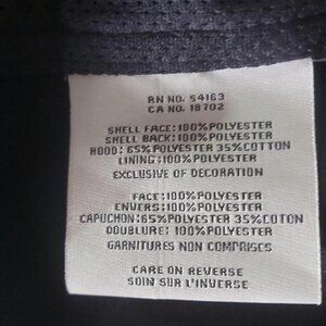 Fabric: Shell 100% Polyester. Hood 65% Polyester, 35% Cotton.