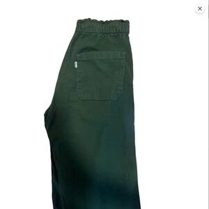 Elastic waistband with drawstring- lays nicely on the hips/waist, not bulky. Sleek side and back pockets, relaxed tapered leg.