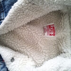 Levi's denim jacket in light blue. Features soft white lining. Button-up front with classic design.
