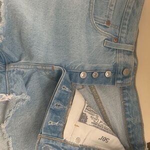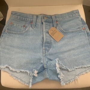 Classic Levi's denim shorts. Light blue wash. Frayed hem. Perfect for casual wear.
