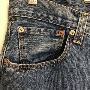 100% Cotton, 5 pockets, belt loops, button fly, logo patch on back.