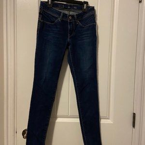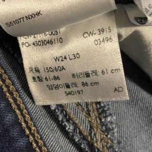 Levi's mid rise skinny jeans, dark blue, Ladies size 24. In excellent condition with no rips or stains. Only flaw is the threading on the red tag on back pocket is coming apart but doesn't effect the wear. Has front and back pockets.
