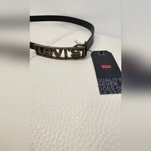 Stylish black leather belt with a Levi's logo buckle. Perfect for any outfit. Length to the last hole: 38".