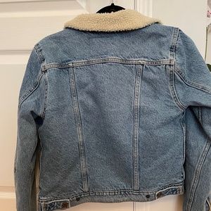 Light blue denim jacket with white/cream/beige fur trim inside.