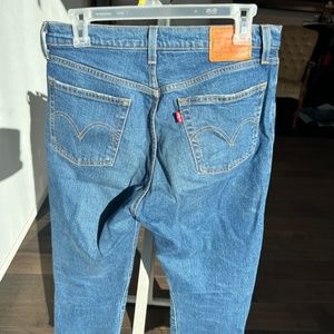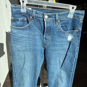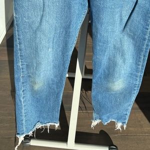 Gently worn in, very comfortable, button crotch (no zipper), dark blue, frayed bottoms.