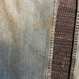 Already Broken in! Soft, light denim with classic straight legs, 5-pockets. Faded legs, some wear spots. Fraying at pockets, zipper placket and gems. Crotch and leg seams in great condition—lots of life yet. Home altered, label says 36” 30”. Actual inseam 26”. No stretch. Some paint or rust on seat/ legs.