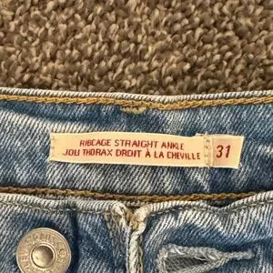 Stylish high rise jeans. Light blue denim. Distressed details. Button fly closure.