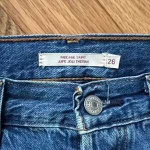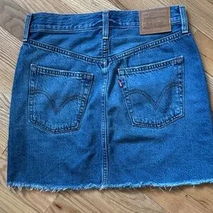 Classic blue denim mini skirt with a raw hem. Versatile everyday style that pairs easily with tees and blouses. Comfortable mid-rise fit with front button and pocket details. Easy-to-wear blue color for casual looks.