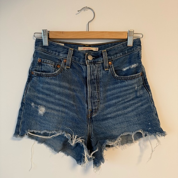 Trendy Levi's jean shorts. Distressed blue denim. Perfect for casual wear.