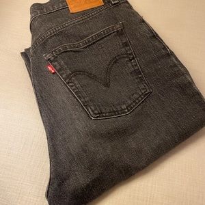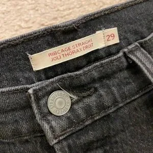 Black wash Levi’s Ribcage straight jeans with raw hem. Excellent condition, very lightly worn. Fits like a 30 Wedgie (softer feel).