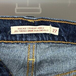 Levi's Ribcage Straight Ankle Premium Denim Dark Wash Jeans. Wash: Dark Stone. Button close. High waist. 5 pocket design. Ankle length. Straight leg. Materials: 99% Cotton, 1% Elastane. Minimal stretch.