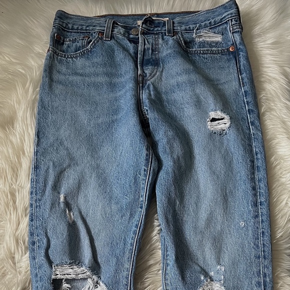 Real Levi's light blue ripped jeans, are super cute mid-rise semi lose jeans, pairs perfectly with a body suit or any tight top and or sweaters, flatters every body type, and even looks great with strappy heels, kitten heels, or if you wanted to ditch the heels these look perfect with sneakers!! These jeans are super versatile!