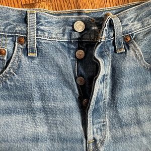 Blue ripped 501 jeans from Levi's, straight leg, raw hem, slightly high-rise, button-up fly, real denim, worn a few times
