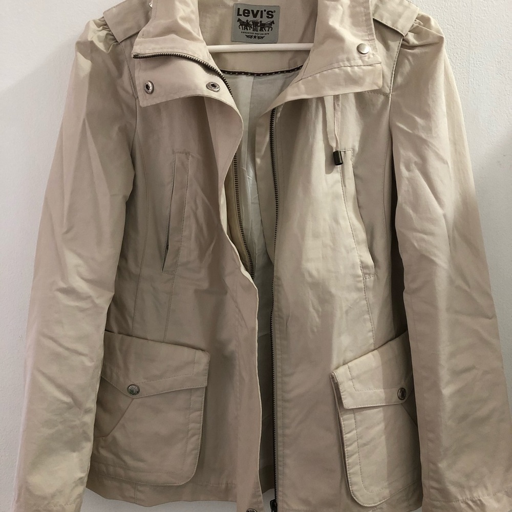 Beige jacket perfect for spring. It has a light stain but can be wash and removable.