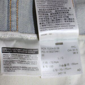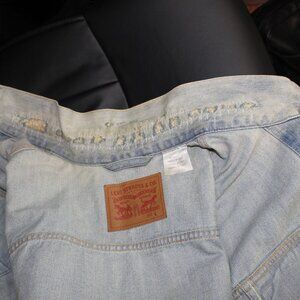 A basic denim light blue jacket is a necessity for any wardrobe, and this men's Trucker jean jacket by Levi's Strauss &Co. is a stylish choice. Straight shoulder yoke on back; CA00342, WPL423, Custom Paint (unknown author) , ripped collar( please look at the photo) ;Pre-owned