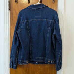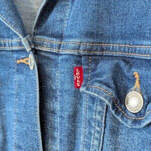 Levi's Trucker Jean Jacket in size 1X. Stretchy jean fabric, long lined (mid-hips), adjustable at the hips, medium indigo color. Light signs of wear.