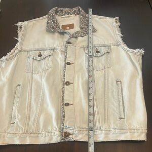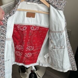 Levi’s Trucker Upcycled Denim Vest with Red Paisley Bandana Print on the back.