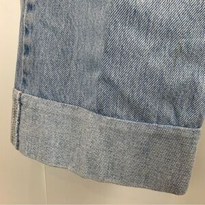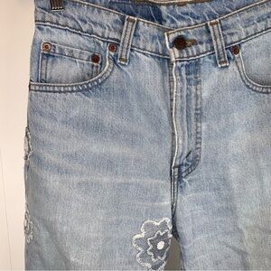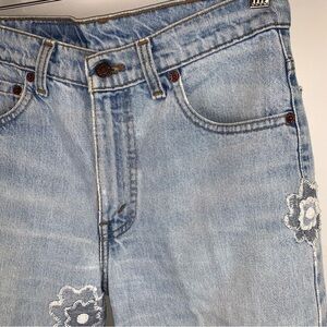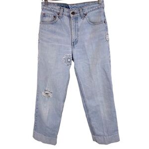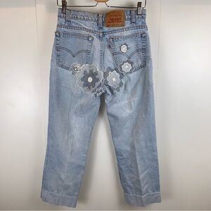 Super fun vintage light wash stiff cotton Levi's hand crafted with denim patches and embroidery - very unique!! Cuffed to ankle length.