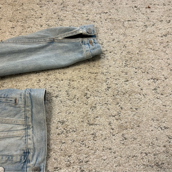 Levi’s vintage M light wash faded denim trucker jacket- excellent used condition- it’s a smaller medium- I will post measurements right away. I have owned it over 10 years and I am a larger Small or smaller medium- so this is a smaller medium. Great wash for the warmer months