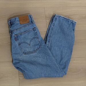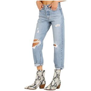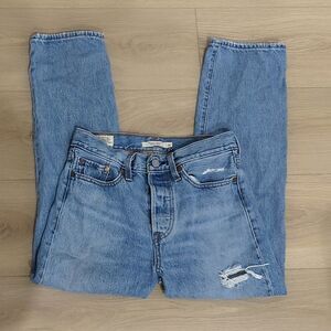 Inspired by vintage Levi’s, the Wedgie has a universally flattering high rise and is specially cut so the front won’t bunch or bag out. These ones have a slightly wider leg opening for a straighter silhouette. They’re made with premium non-stretch denim. This version is medium blue and has ripped knees and shredded holes.