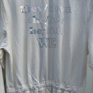 Celebrate inclusivity and comfort with this Levi’s gender-inclusive white denim jumpsuit, featuring a relaxed silhouette, drawstring waist, and utility-style pockets. The standout detail? A bold, iridescent back print proudly displaying pronouns:
