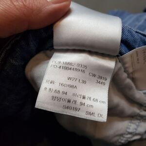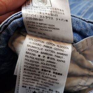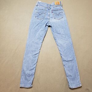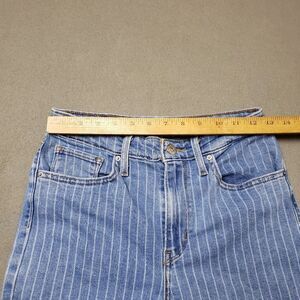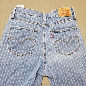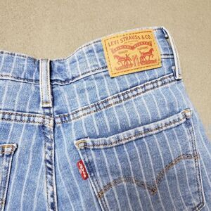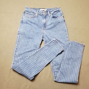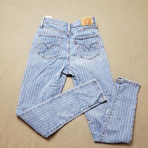 Stylish high rise jeans by Levi's. Features a blue and white striped pattern. Perfect for casual wear.