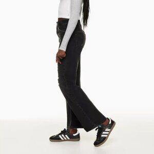 These are Levi’s® Premium jeans with a super high rise and a straight leg cut to the ankle. They fit slim through the hip and are cut from comfort-stretch denim made with organic cotton. This version comes in a black wash with distressing and a clean hem.