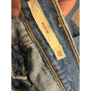 The product is a pair of Levi's Women’s Wedgie Straight Blue Denim jeans in size 32, with a 28” inseam. Made from denim fabric, these straight-cut jeans are designed for regular fit in the women's department. The classic blue color and Levi's brand name make them a versatile and stylish addition to any wardrobe. Perfect for everyday wear or dressing up, these jeans offer comfort and style for any occasion.