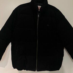 This NWOT corduroy puffer jacket from Levi's features a cropped bubble style, a stand up collar, an adjustable drawstring at the inner hem on either side, elastic cuffs, a front zipper closure, two lower welt hand pockets, and Levi's logos at the left chest and lower left seam.