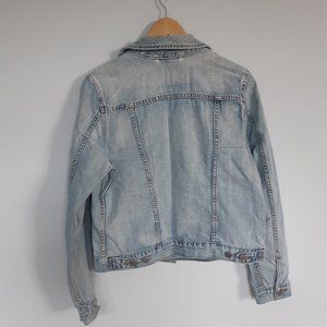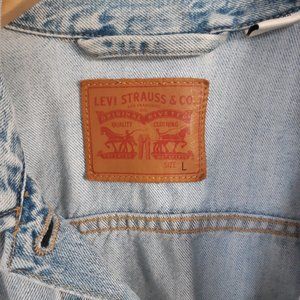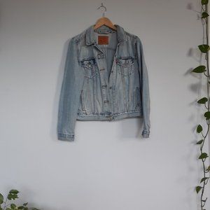 Levi's jean jacket, light wash denim, 100% cotton. Decent condition, well worn but no rips, stains, and all buttons are intact. 4x pockets.