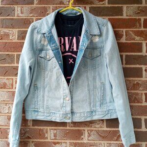 Light wash denim jacket features a beautiful white floral embroidery, adding a feminine touch to its classic design.
