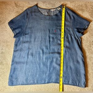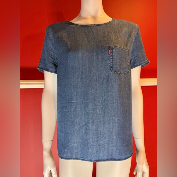 Levi’s blue denim (100% Lyocell) t-shirt featuring a front pocket. Excellent condition. Soft texture, fits nicely. I am broad shouldered and this is snug in the shoulders but then that gives it a nice drape.