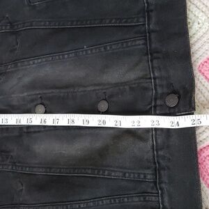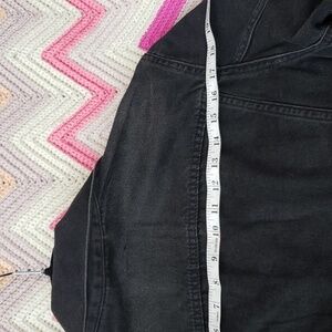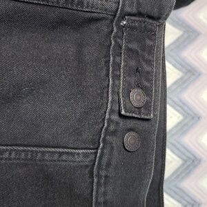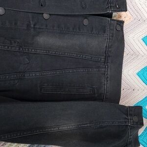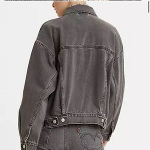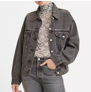 this iconic Levi's denim jacket is a vintage fit in size small. the colour of the denim jacket is black. it features metal buttons and 4 pockets. 2 pockets at the bottom and 2 pockets on the chest. the material is cotton.