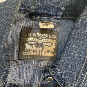 This Levi's Jeans vest in size Small is the perfect addition to any casual outfit. Made of 100% cotton denim fabric, it features a faded dark blue color and a button closure. The vest has a collar and is accented with rivets and buttons. It has no lining and is perfect for layering.uses in perfect condition that will surely last longer.